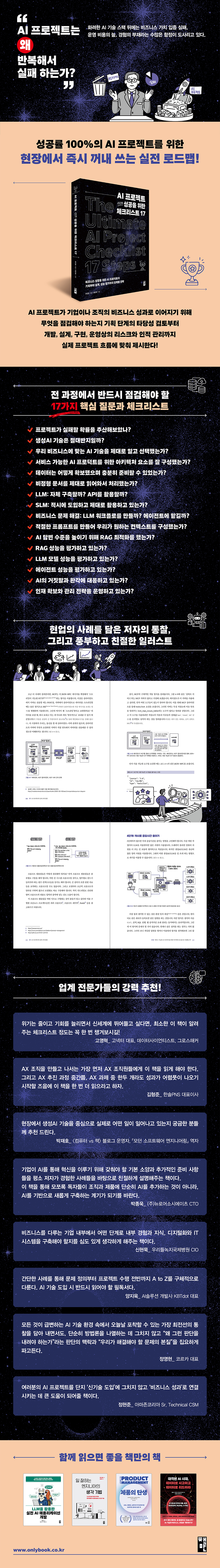이 책은 AI 프로젝트가 왜 반복해서 실패하는지에 대한 물음으로 출발해, 기획 단계의 타당성 검토부터 개발, 설계, 구현, 운영상의 리스크 관리까지 전 과정에서 반드시 점검해야 할 17가지 핵심 질문과 체크리스트를 실제 프로젝트 흐름에 맞춰 제시한다.