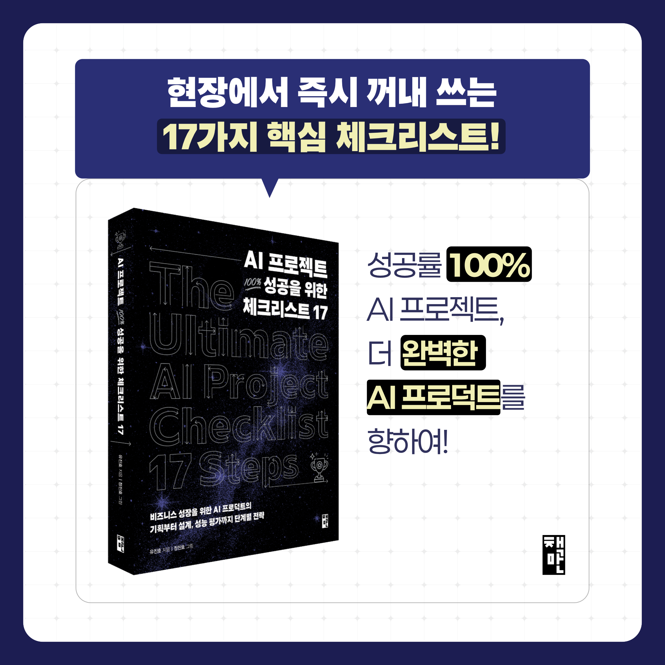 저는 ‘좋은 것이 무엇인지’ 알려줄 수 있는 지도 같은 것이 필요했습니다. 그러나 이를 찾기가 쉽지는 않았습니다. 결국 제가 선택할 수 있는 방법은 ‘스스로 지도를 만드는’ 것뿐이었습니다. 제가 본 것, 들은 것, 해본 것, 찾은 것, 또 주위에서 해주는 이야기들을 하나씩 적고 스크랩하고 정리하면서 그 속의 의미들을 고민하는 것부터 시작했습니다. 그러다 보니 저와 비슷하게 AI를 이용해서 뭔가를 하려는 사람들에게 도움이 될 수 있는 자료들을 만들 수 있었습니다. 처음에는 이 내용들을 백과사전처럼 정리했습니다. 그러다가 출판사로부터 ‘체크리스트’처럼 정리하는 것이 읽는 사람들에게 더 도움이 되겠다는 피드백을 받았습니다. 그래서 AI 프로젝트를 하거나 프로덕트를 기획할 때 꼭 가야 하는 길을 알려주고, 피해야 하는 ‘암초’들의 위치를 알려주는 17가지 체크리스트들을 각 장의 ‘제목’으로 삼아 제가 직접 현장에서 경험한 세부 사항들을 정리했습니다.