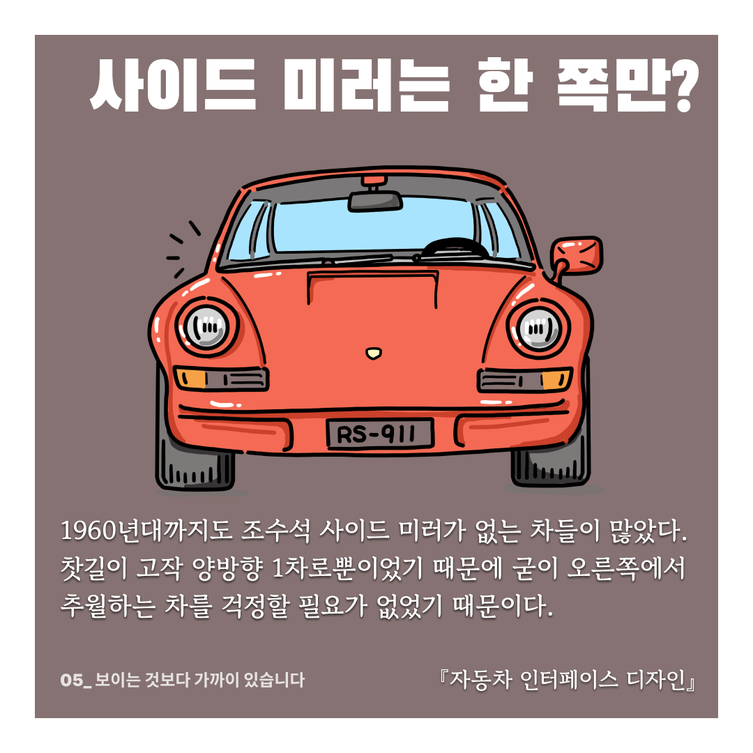 1960년대까지도 조수석 사이드 미러가 없는 차가 많았다. 찻길이 고작 양방향 일차로뿐이었기 때문에 굳이 오른쪽에서 추월하는 차를 걱정할 필요가 없었기 때문이다. 그러니, 앞에 저속 차량이 있으면 그저 중앙선을 넘어 추월하면 되는 식이었고, 이런 상황들을 감안해서 사이드 미러는 운전석 하나로 충분했던 것이다. 물론 원가를 아껴야 하는 제조사 입장에서라면 충분히 일리가 있다.