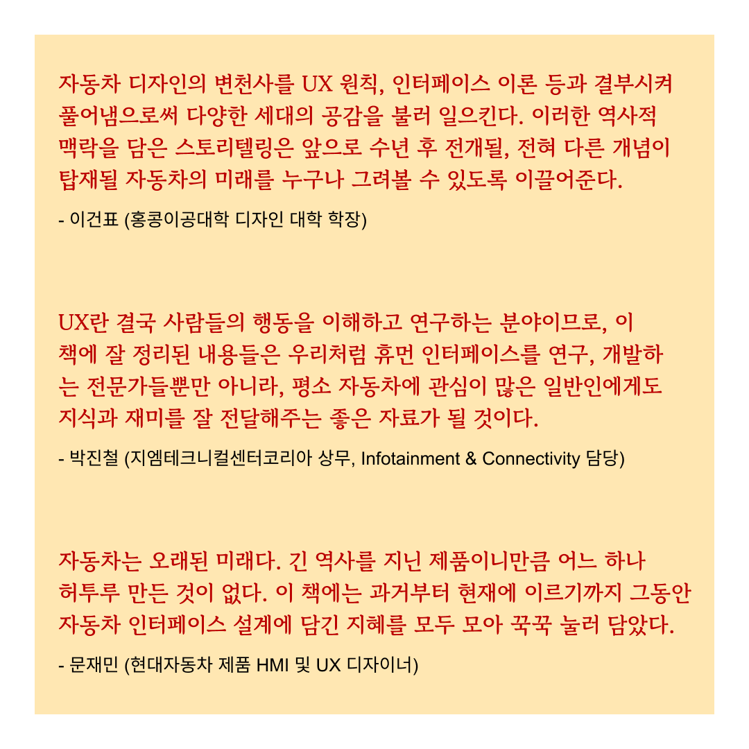 오늘날은 인간의 제품에 대한 인터랙션이 점점 모바일 안으로 침투해 들어가면서 그간의 오랜 실험과 노력에 의한 UX의 위상이 더욱 고민되는 시점이기에, 여러 상황하에 빠른 판단으로 위험 없이 작동해야 하는 자동차와 같은 제품들에서는 여전히 UX가 강력한 수비수 역할을 해줘야 합니다. 모쪼록 이 책의 출간이 많은 이에게 UX가 인간-제품을 잇는 데 얼마나 중요한지를 설득할 수 있는 계기로 쓰이길 바랍니다.