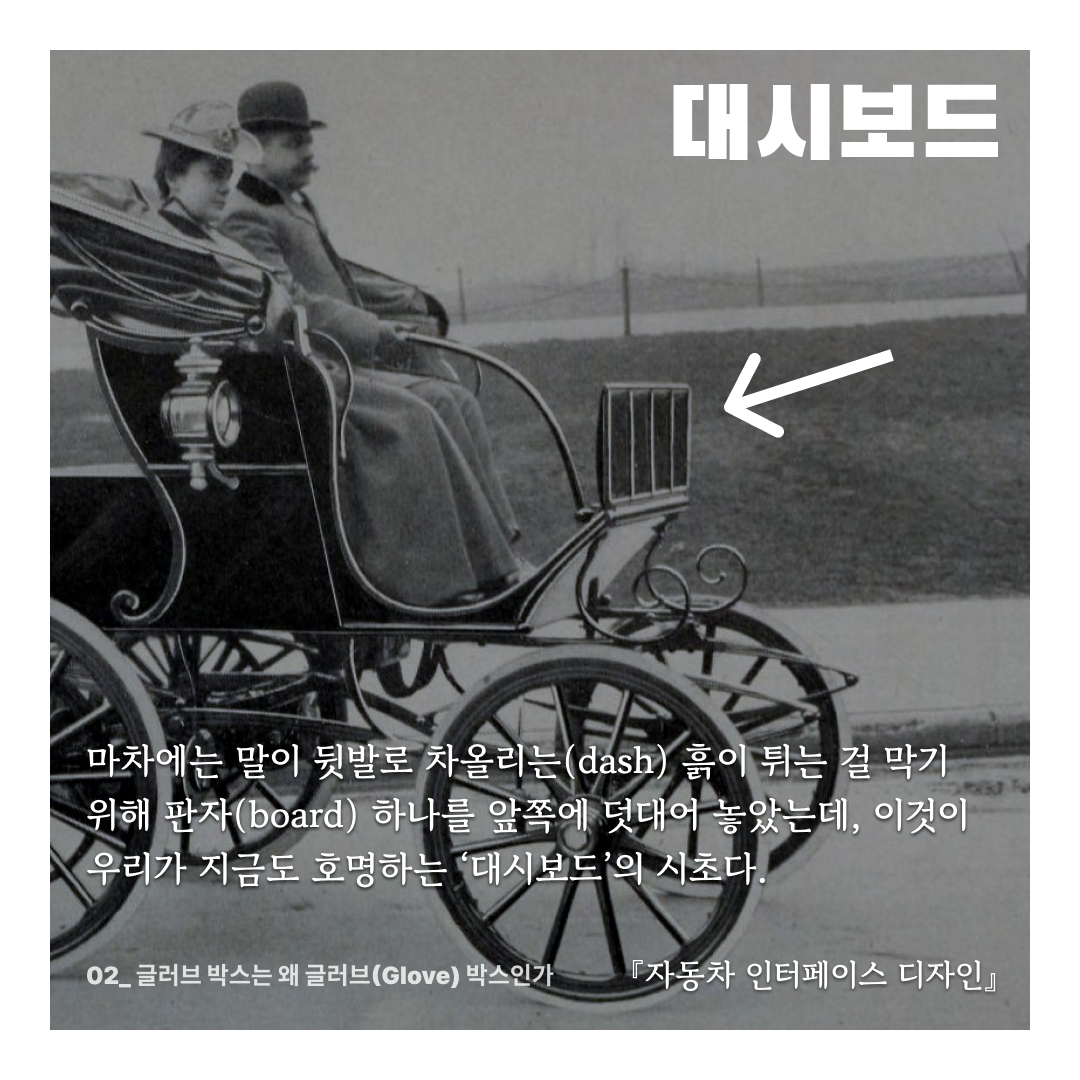 우리가 흔히 말하는 ‘대시보드(dashboard)’라는 구조물도 사실 여기서 비롯된 것이다. 마차에는 말이 뒷발로 차올리는 흙이 튀는 걸 막기 위해 판자 하나를 앞쪽에 덧대어 놓았는데, 이것이 우리가 지금도 호명하 는 ‘대시보드’의 시초다.