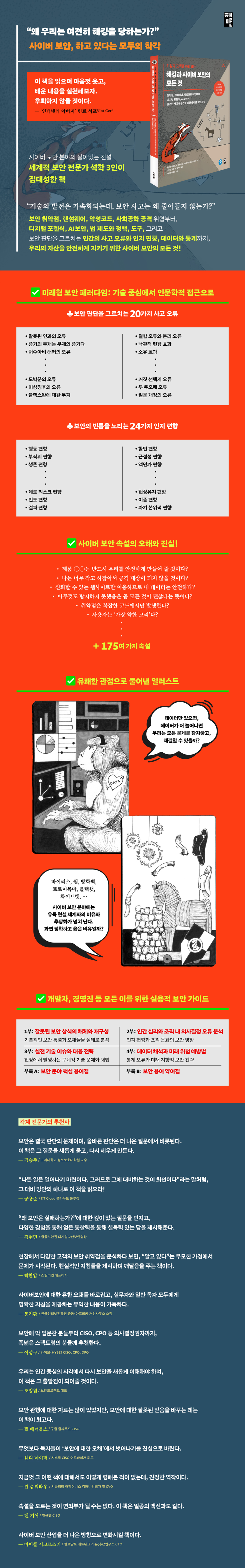 현장에서 다양한 고객의 보안 취약점을 분석하다 보면, “알고 있다”는 무모한 가정에서 문제가 시작되는 경우가 많았다. 안전한 시스템을 위해서는 이와 같은 위험한 통념을 깨부수는 일이 우선적이다. 그런 의미에서 이 책은 취약점과 랜섬웨어, AI보안과 같은 분야에 대해 현실적인 지침들을 제시하며 깨달음을 준다.