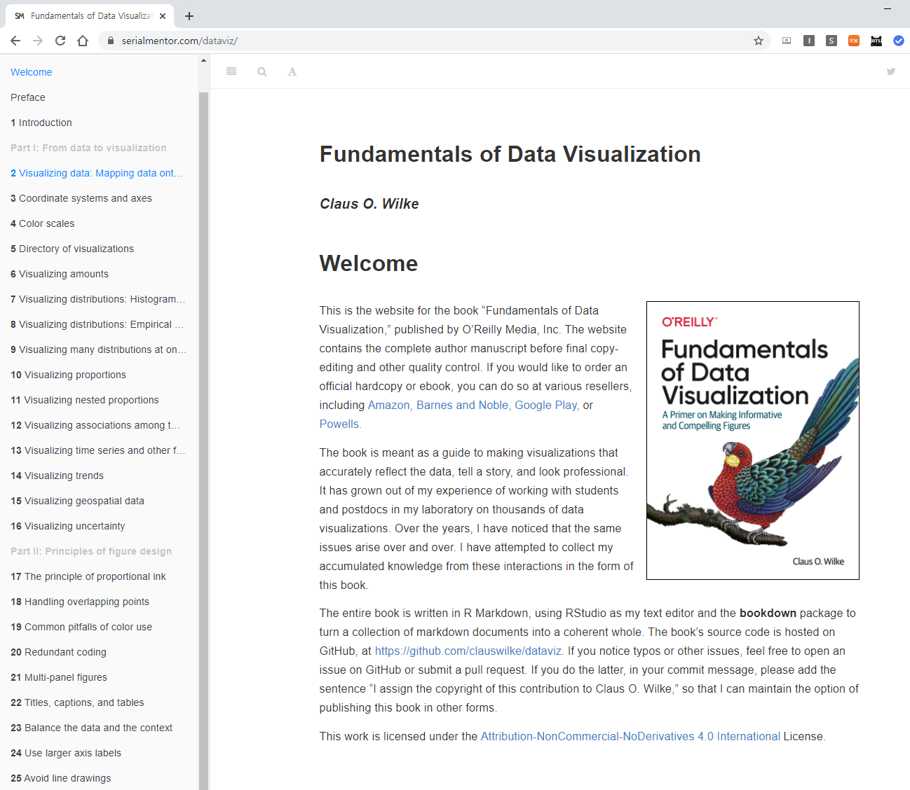 저자 클라우스 윌케(Klaus O. Wilke)는 『데이터 시각화 교과서』 책 원서 『Fundamentals of Data Visualization』 전체 내용을 R 마크다운(Markdown)에서 bookdown, knitr R 패키지를 사용해 작성했습니다. 또한 책에 포함되는 모든 그래프와 차트, 도표는 ggplot2와 cowplot, geofacet, ggforce, ggmap, ggrepel, ggridges, hexbin, patchwork, sf, statebins, tidybayes, treemapify 등의 패키지를 함께 활용해 제작했으며, 도표의 색상은 colorspace와 colorblindr 패키지를 사용했습니다. 또한, 책의 내용을 모두 학습한 뒤 차트를 생성하는 구체적인 코드가 궁금하거나 참고하려는 독자들을 위해 저자는 책의 전체 내용을 웹 문서나 깃북으로 렌더링할 수 있는 프로그래밍 코드(https://github.com/clauswilke/dataviz)와 이를 컴파일하기 위해 필요한 R 패키지(https://github.com/clauswilke/dviz.supp)를 깃허브에 공개했으며, 전체 책은 저자의 사이트(https://serialmentor.com/dataviz/)에서 볼 수 있습니다.