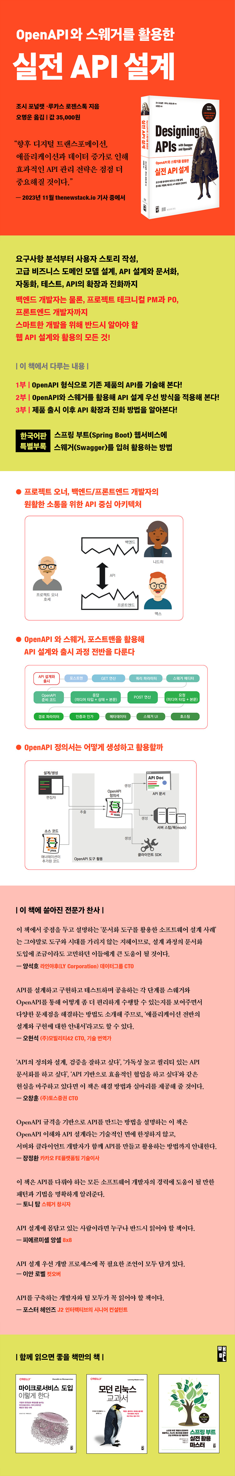- [한국어판 특별부록] 스프링 부트 앱에 스웨거 UI 입혀보는 예제 소스 코드: https://github.com/onlybooks/design-api