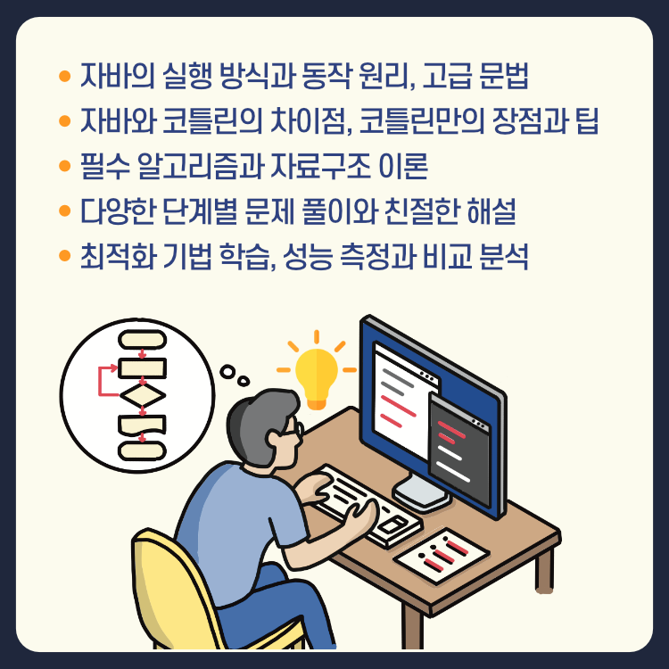 - 자바에 익숙하지 않은 독자를 위해 자바의 실행 방식과 동작 원리, 고급 문법을 함께 설명한다.