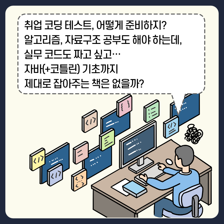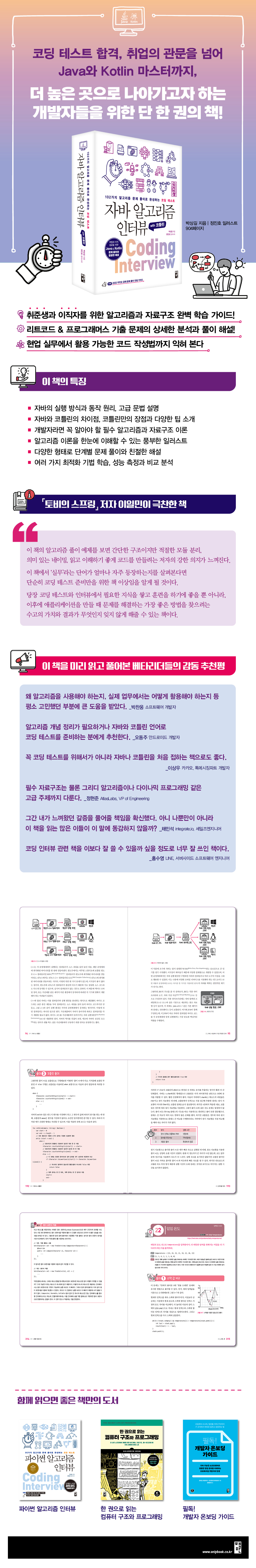 이 책 한 권이면 취업이나 이직 준비는 물론, 현업에서도 바로 활용 가능한 실무 코드를 학습할 수 있는 기본기를 다질 수 있다. 200여 가지가 넘는 풍부한 일러스트를 통해 알고리즘과 자료구조의 기초도 다시 한번 탄탄히 다져보자.