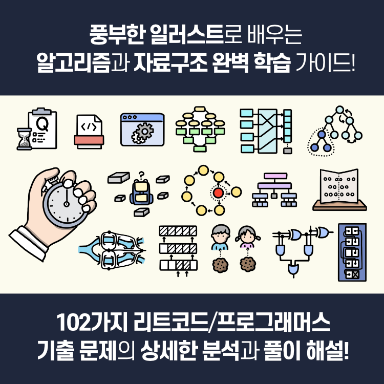 - 알고리즘을 이해하기 어려워하는 독자를 위해 알고리즘에 대한 다양한 시각화 일러스트를 곁들였다.