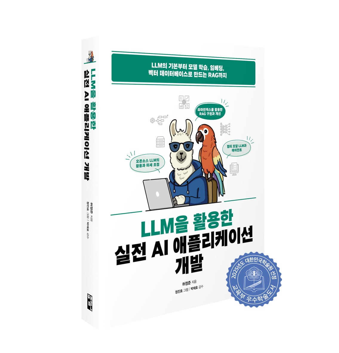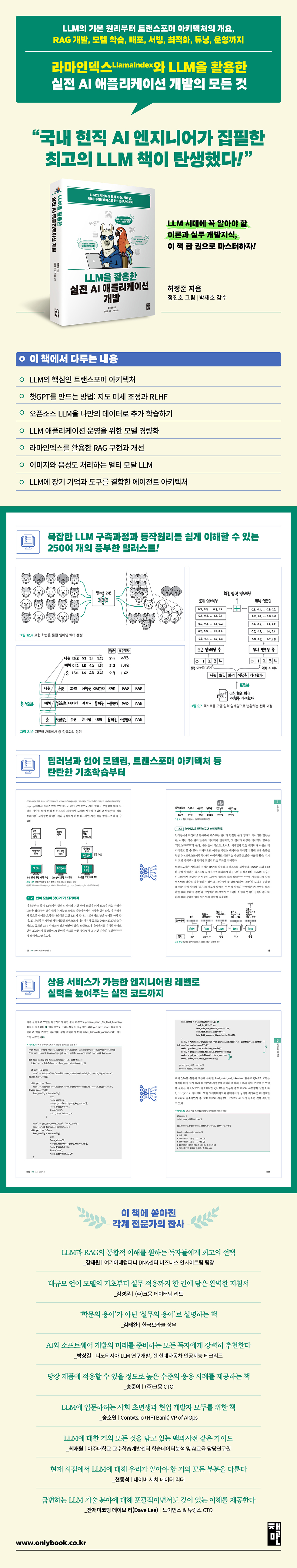 허정준님의 책은 LLM의 중추가 되는 트랜스포머 아키텍처부터 오픈소스 LLM의 활용과 미세 조정, 라마인덱스를 활용한 RAG 구현과 개선, 멀티모달 LLM과 에이전트까지 폭넓은 주제를 알차게 구성해 다루고 있습니다. 주요 핵심 개념들을 이해하기 쉽게 정리하고 실무자들이 손쉽게 따라할 수 있게 한 점이 특히 인상적이었습니다.