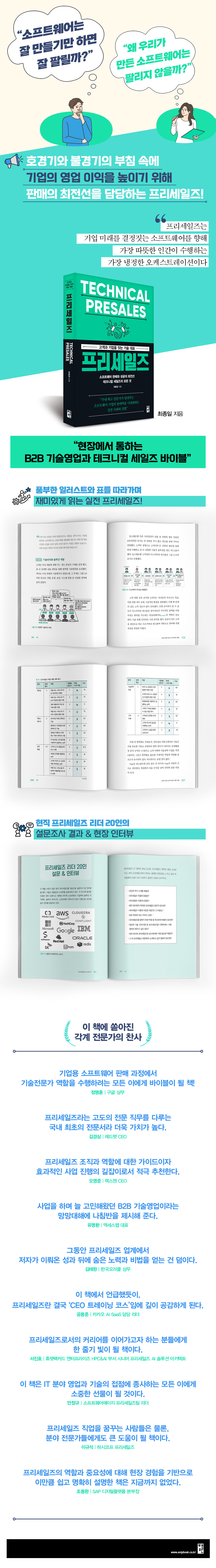 모쪼록 이 책이 소프트웨어 산업에 대한 이해를 높이고, 프리세일즈 커리어로의 유익한 길잡이 역할을 해줄 것을 고대한다.