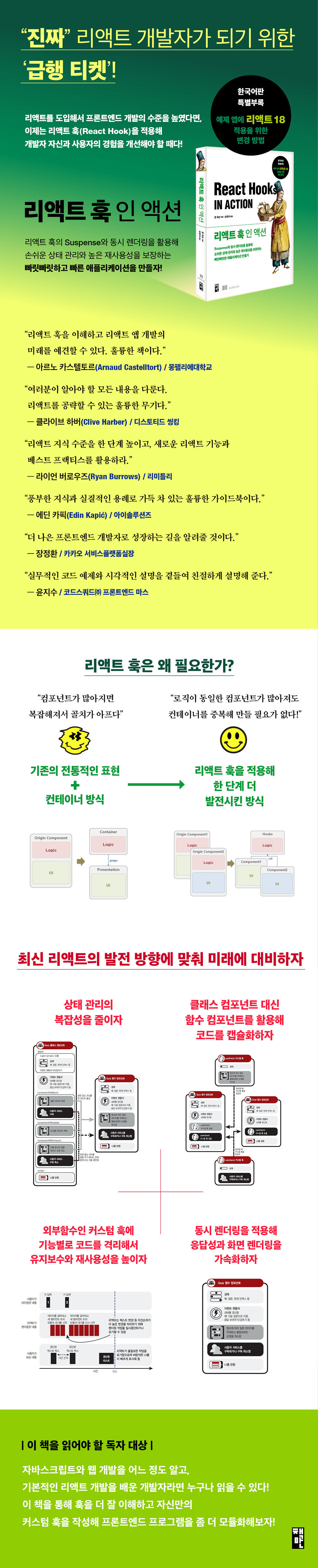 또 리액트를 잘 모르는 프론트엔드 개발자라 하더라도, 그림을 통해 클래스 컴포넌트의 여러 부분이 어떻게 함수 컴포넌트와 훅으로 바뀌는지에 대해 자세히 설명해 주고, useState 훅을 사용한 컴포넌트 상태 관리로부터 useReducer를 통해 상태를 여러 컴포넌트에 공유하는 방법, useRef 훅을 사용해 참조를 공유하는 방법 등 리액트 함수 컴포넌트를 사용해 웹 앱을 만들 때 필요한 여러 기능을 차근차근 설명해 나가기 때문에 리액트 초보자가 리액트 기초를 쌓고 싶을 때도 도움이 된다. 이 책이 훅을 사용하는 리액트 프로그래머들에게 작게나마 도움이 되길 바란다.