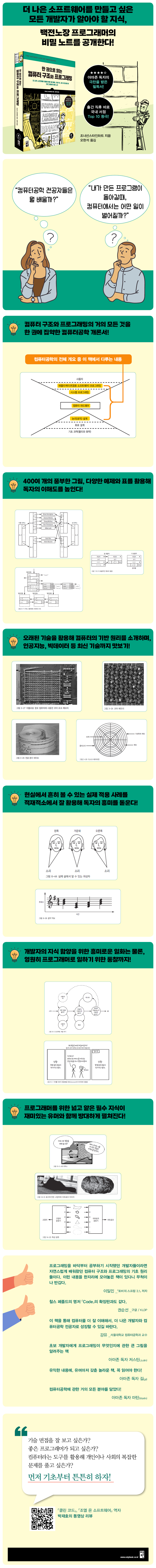 프로그램을 그럭저럭 작성하는 것은 누구나 흔히 할 수 있는 일이지만, 프로그램을 애초부터 더 나은 방식으로 만들거나 또는 나중에 발생한 문제를 해결하고 개선하는 일은 프로그램이 컴퓨터에서 어떤 여정을 거쳐 실행되는지 아는 사람만이 할 수 있다. 그런 사람이 되고 싶다면 이 책만 한 길잡이가 없을 것이다. 컴퓨팅의 가장 기저에 있는 표현 방식과 내부 하드웨어 구조부터 시작해서 통신, 데이터 처리, 언어, 보안, 인공지능, 개발방법론에 이르기까지 이렇게 한 권에 모아볼 수 있는 책은 개발계의 규화보전이라 할 수 있겠다.