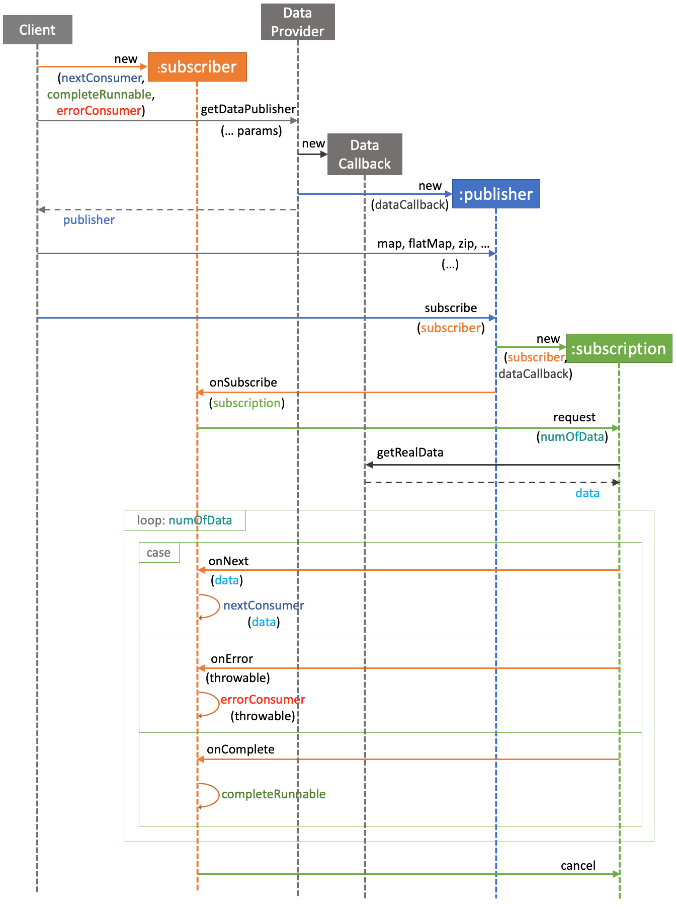 리액티브 프로그래밍을 하다 보면 수많은 다양한 리액티브 연산자의 늪에 빠져 허우적대기 쉽다. 중심을 잃지 않고 계속 앞으로 나아갈 수 있도록 리액티브 스트림의 전체적인 협력 구조를 시퀀스 다이어그램을 통해 조망해본다. 본문을 읽기 전에 부록을 먼저 훑어보면 책 내용을 이해하는 데 도움이 될 것이다.