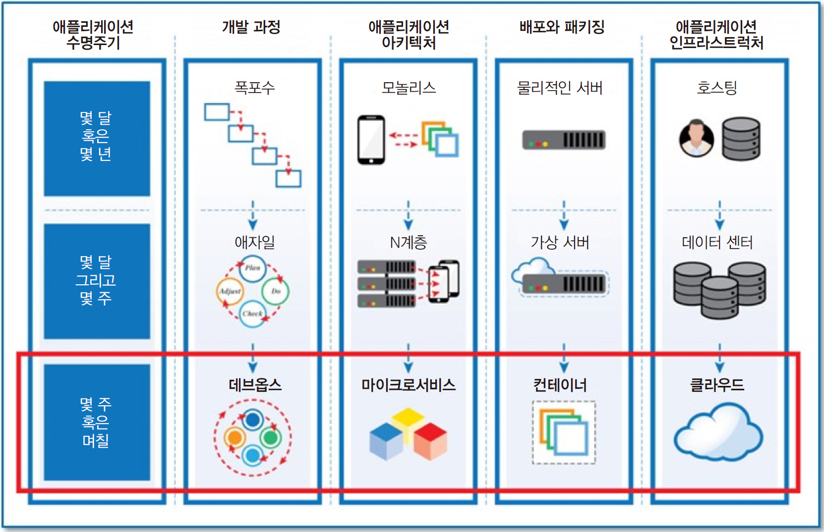 이 다이어그램이 뜻하는 바는 명징하다. 군사용 소프트웨어와 관련해 애플리케이션 수명주기를 주에서 일 단위로, 개발 과정을 데브옵스로, 애플리케이션 아키텍처를 마이크로서비스로, 배포와 패키징을 컨테이너(도커와 쿠버네티스)로, 인프라스트럭처를 클라우드로 바꾸는 것이다.